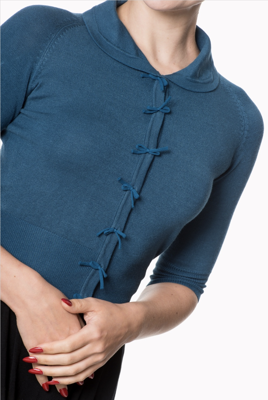 Diese petrolfarbene Strickjacke besticht durch ihre elegante Struktur und den einzigartigen Kragen. Sie verfügt über eine dekorative Knopfleiste mit filigranen Schleifendetails. Die dreiviertellangen Ärmel und die taillierte Passform verleihen der Jacke einen femininen und stilvollen Look. Perfekt, um jedem Outfit einen Hauch von Eleganz und Individualität zu verleihen.