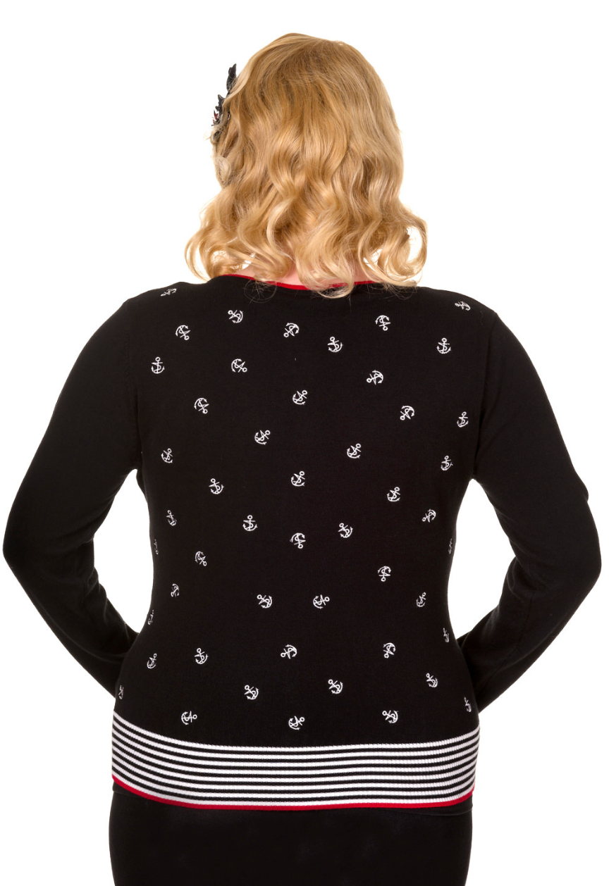 Schwarze Strickjacken mit weißen gestickten Ankern. Zum Kontrast sind die Bündchen an Ärmeln und Bund schwarz-weiß gestreift. Am Hals und der Knopfleiste ist er noch in rot abgesetzt, die perfekte Ergänzung zu Deinem Outfit