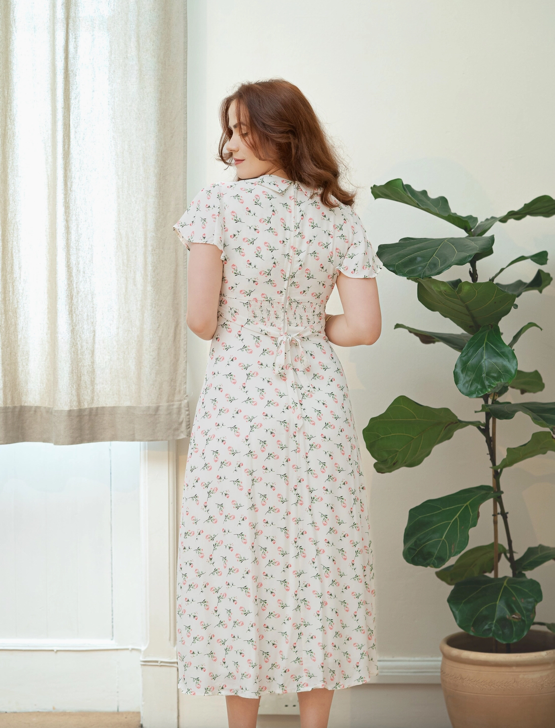 Wir stellen Salome vor, den Inbegriff von Vintage-inspirierter Eleganz. Mit seinen zarten Kragen, flatternden Ärmeln und der Midi-Länge lässt sich dieses Kleid mühelos vom Wochentag zum Wochenende übergehen. Der Empire-Taillenbund dehnt sich aus und schmeichelt, während der gesmokte Rücken und die Krawatte für eine perfekte, individuelle Passform sorgen. Salome ist aus nachhaltigem Viskosestoff gefertigt und ist sowohl stilvoll als auch bewusst.