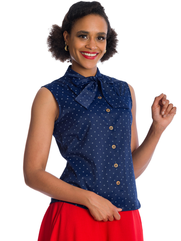 Ärmellose Bluse mit Ankermuster und Holzknöpfchen in braun.