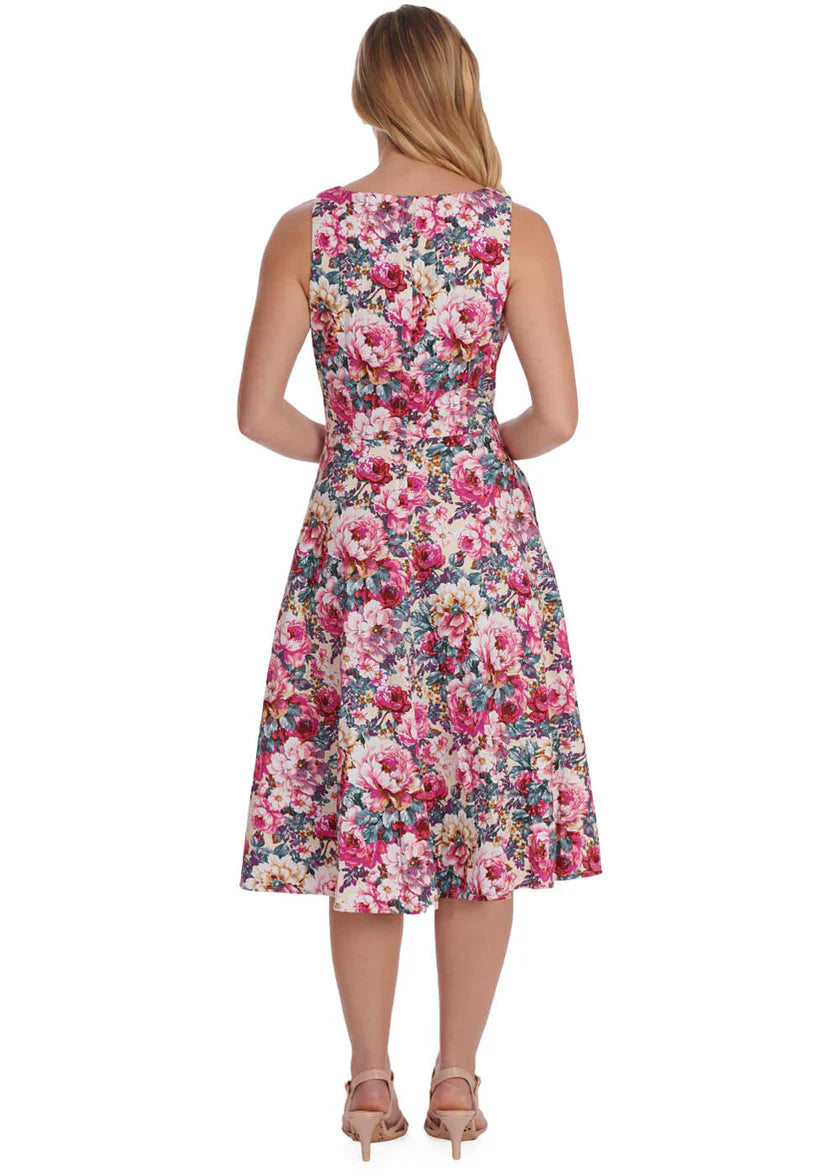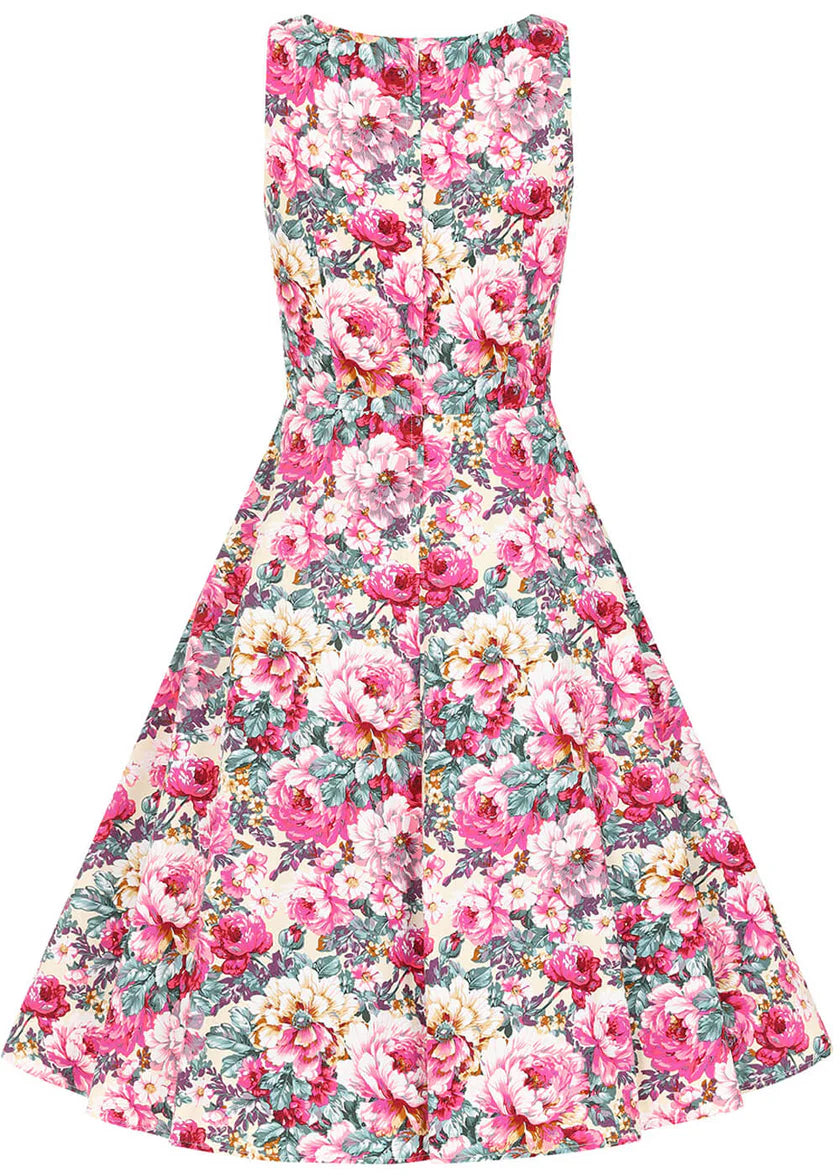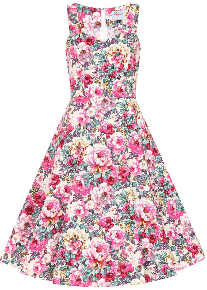 Erleben Sie den Sommer mit dem Swingkleid Bloom Dress! Mit breiten Trägern, herzförmigem Ausschnitt und Wiener Nähten für eine elegante Passform. Der weite Rock, der knapp über der Taille beginnt, kann mit einem Petticoat kombiniert werden und bringt die Rosen zum Blühen. Auf einer Körpergröße von 1,70 m reicht es bis zum Knie und wird hinten mit einem Reißverschluss geschlossen. Ein zeitloser Klassiker, der nie aus der Mode kommt!