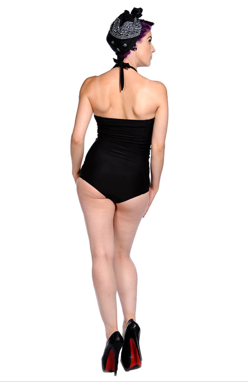 Dieser einteilige schwarze Badeanzug mit Totenkopf- und Rosendruck auf der Vorderseite hat ein tailliertes Oberteil, das für einen schlanken Look sorgt. Die Rückseite und die Hose sind schwarz, ebenso wie der Neckholder. Er sieht beim Sonnenbaden oder Schwimmen umwerfend aus und ist ein wichtiger Bestandteil jeder Urlaubsgarderobe. Er besteht aus Nylon und Elastan und behält auch nach häufigem Tragen sein wunderbares Aussehen und seine Form. Die Hauptmerkmale des Skull Roses-Badeanzugs sind: Einteiliger schwarzer Neckholder mit Totenkopf- und Rosendruck 80 % Nylon 20 % Elastan 100 % Nylon-Futter