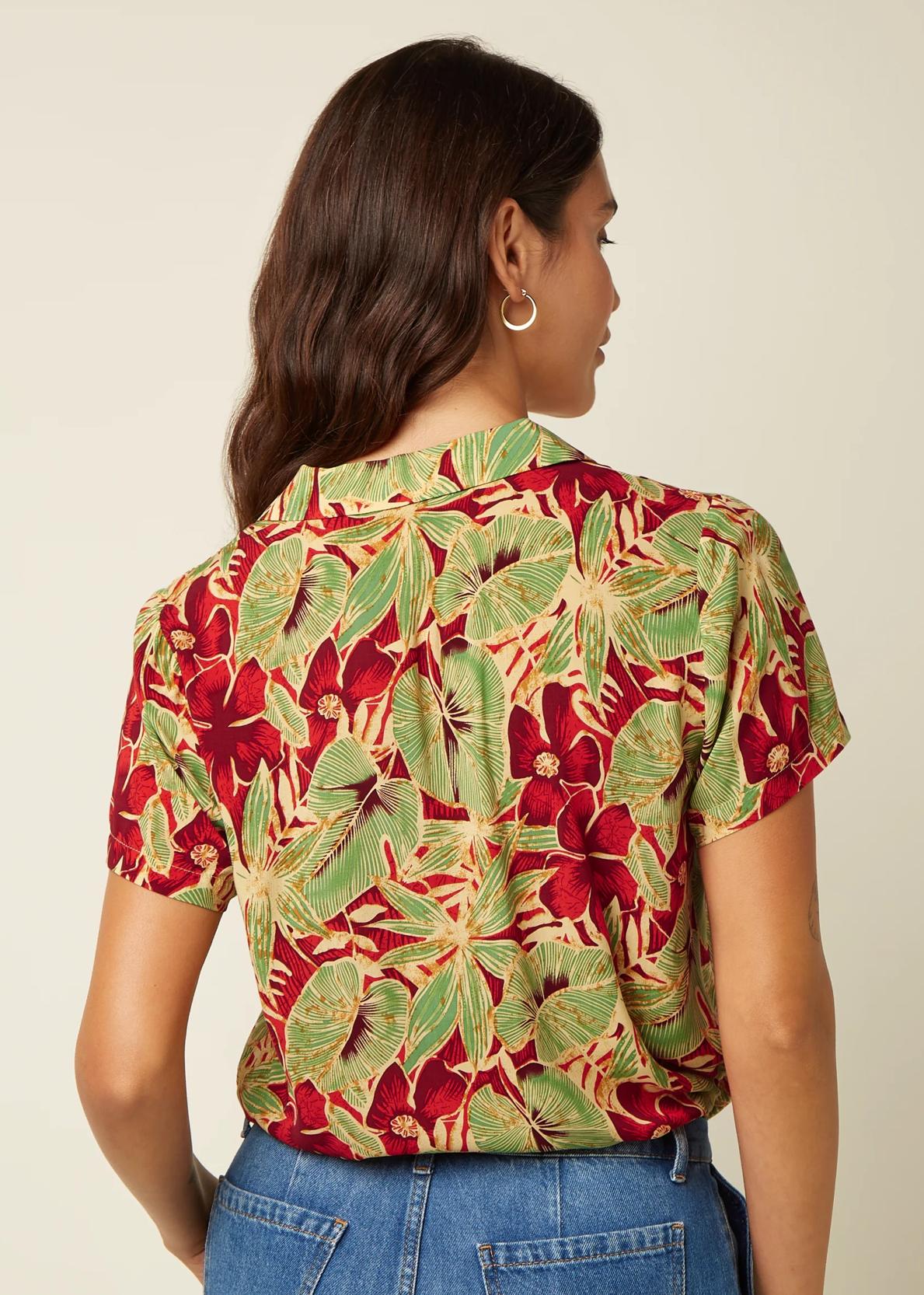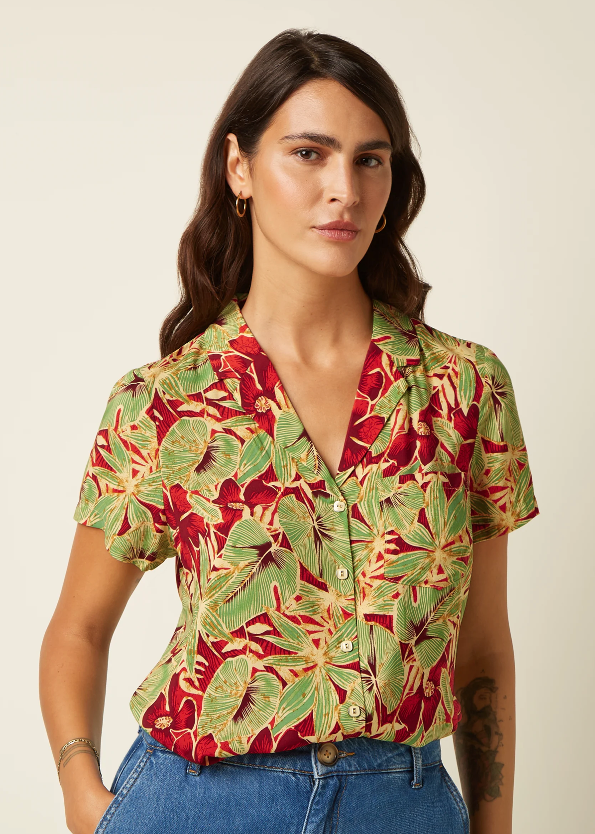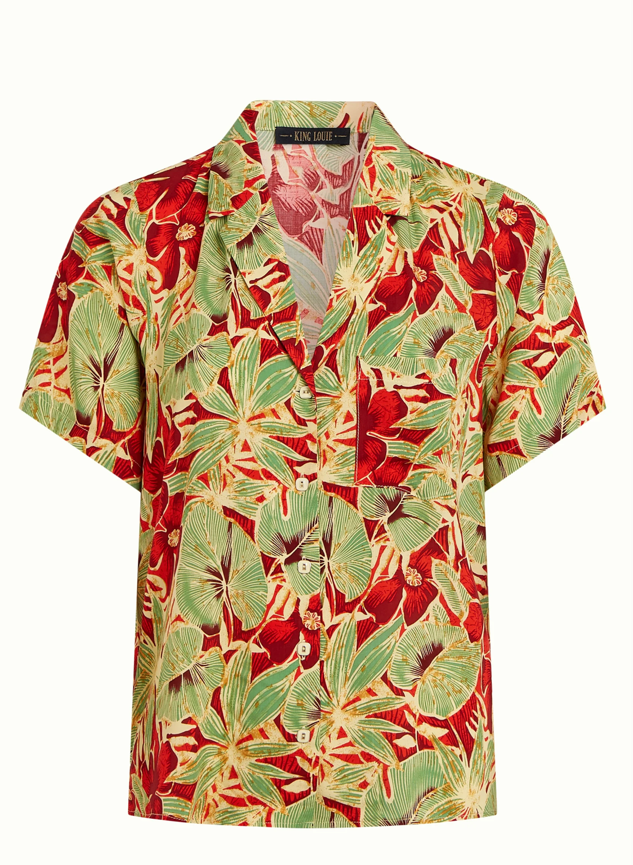 Die Bella Blouse Rico ist eine leichte, kurzärmelige Hemdblusen‑Bluse mit retro‑inspiriertem Print und femininer Passform. Der dezente Reverskragen, die feine Knopfleiste und die praktische Brusttasche verleihen der Bluse eine lässig‑elegante Ausstrahlung – ideal für sommerliche Looks oder als stilvolles Layering‑Piece.