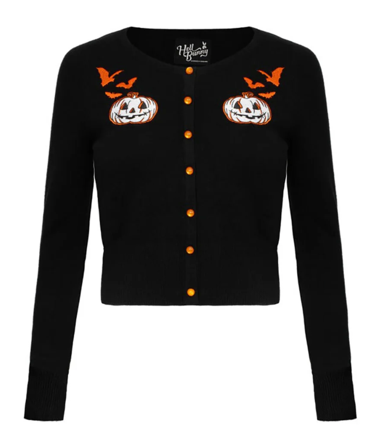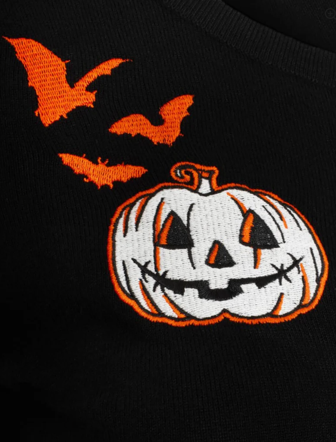 Der Cardigan mit Kürbis- und Totenkopf-Design ist ein stilvolles und auffälliges Kleidungsstück, ideal für die kühle Jahreszeit und Halloween. Gefertigt aus weich gestricktem Material, bietet dieser Cardigan nicht nur Wärme, sondern auch Komfort. Die schicke schwarze Farbe wird durch die leuchtend orangefarbenen Fledermäusen und  Kürbisse mit Totenköpfe auf der Vorderseite ergänzt, was für einen interessanten Kontrast sorgt.