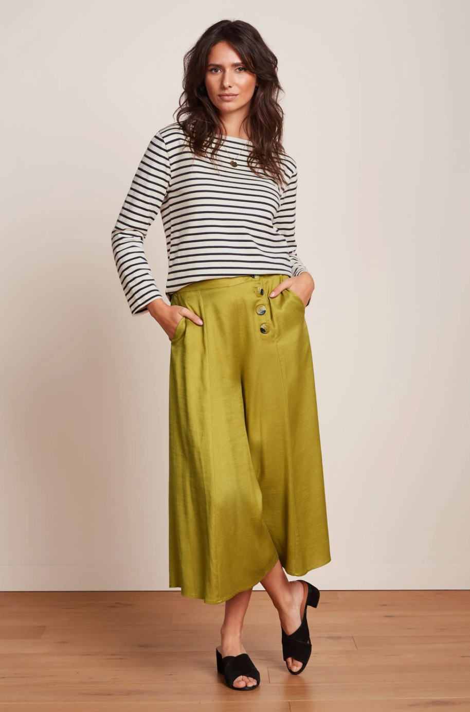 Zurück in die Vergangenheit mit unserer Dallas Culotte aus einer Viskose-Leinen-Mischung, mit einer Retro-Knopfleiste und einer fließenden Silhouette für ganztägigen Komfort.