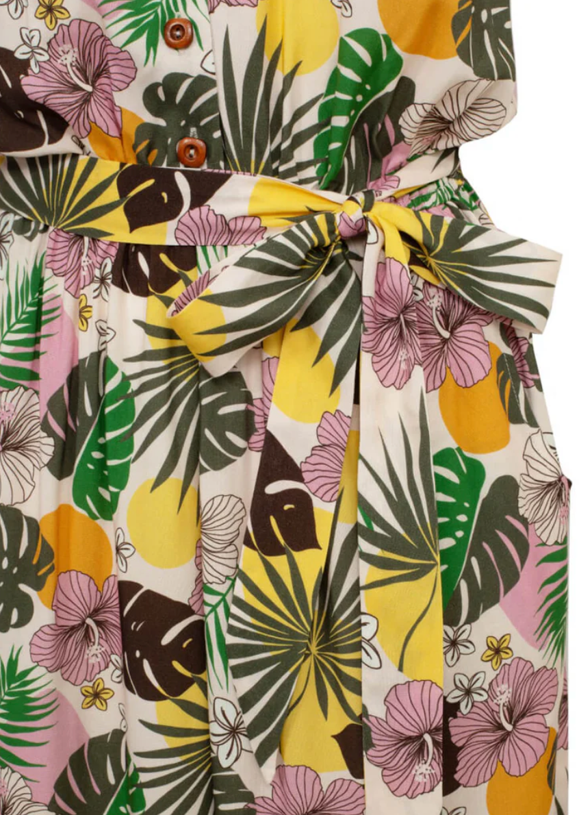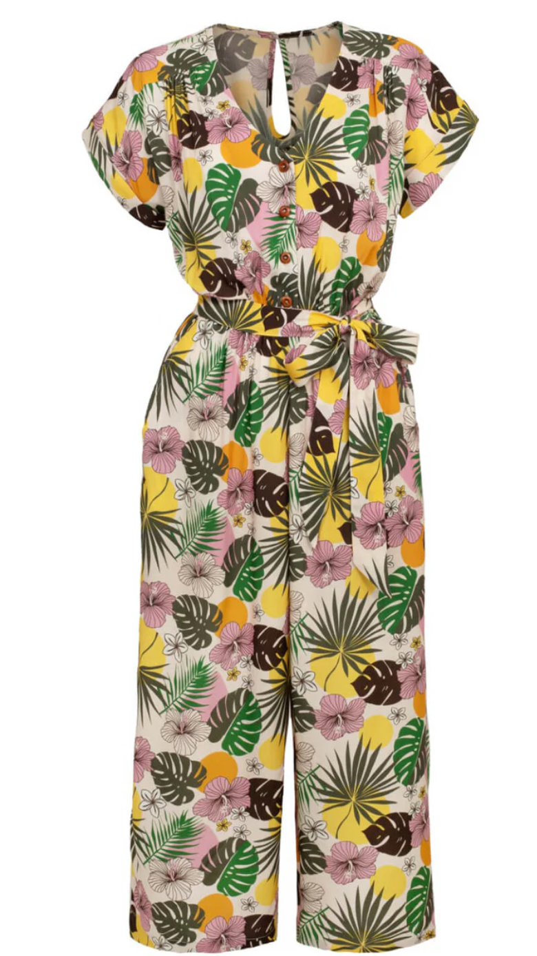 Der Jumpsuit Benita mit dem schönen tropischen Print lässt deine Gedanken in die ferne schweifen. Mit Benita und dem perfektem Tiki-Print bist du (zumindest in Gedanken) schon in deinem im Urlaub.