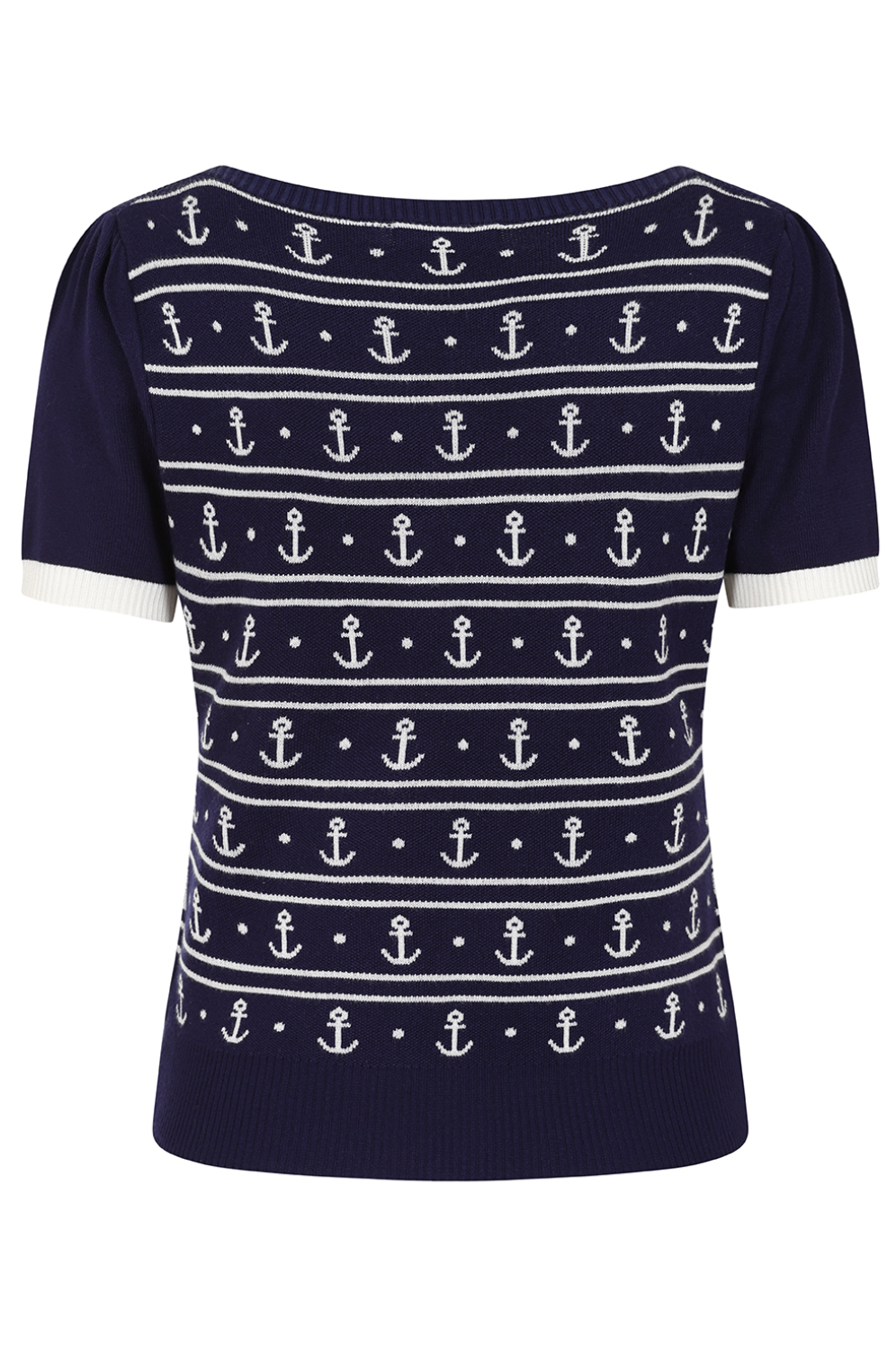 Ein Top, das durch sein verspieltes Muster und seine klassische Farbgebung besticht und jedem Outfit einen Hauch von maritimer Eleganz verleiht.