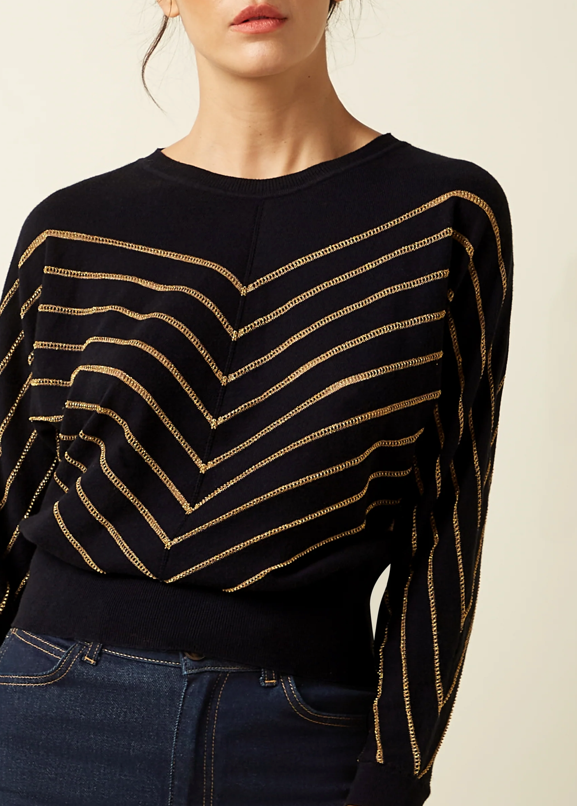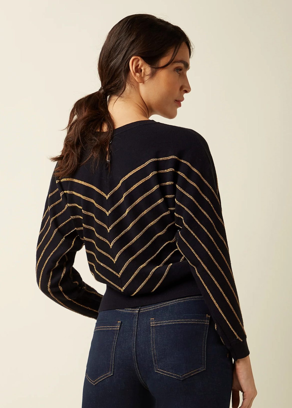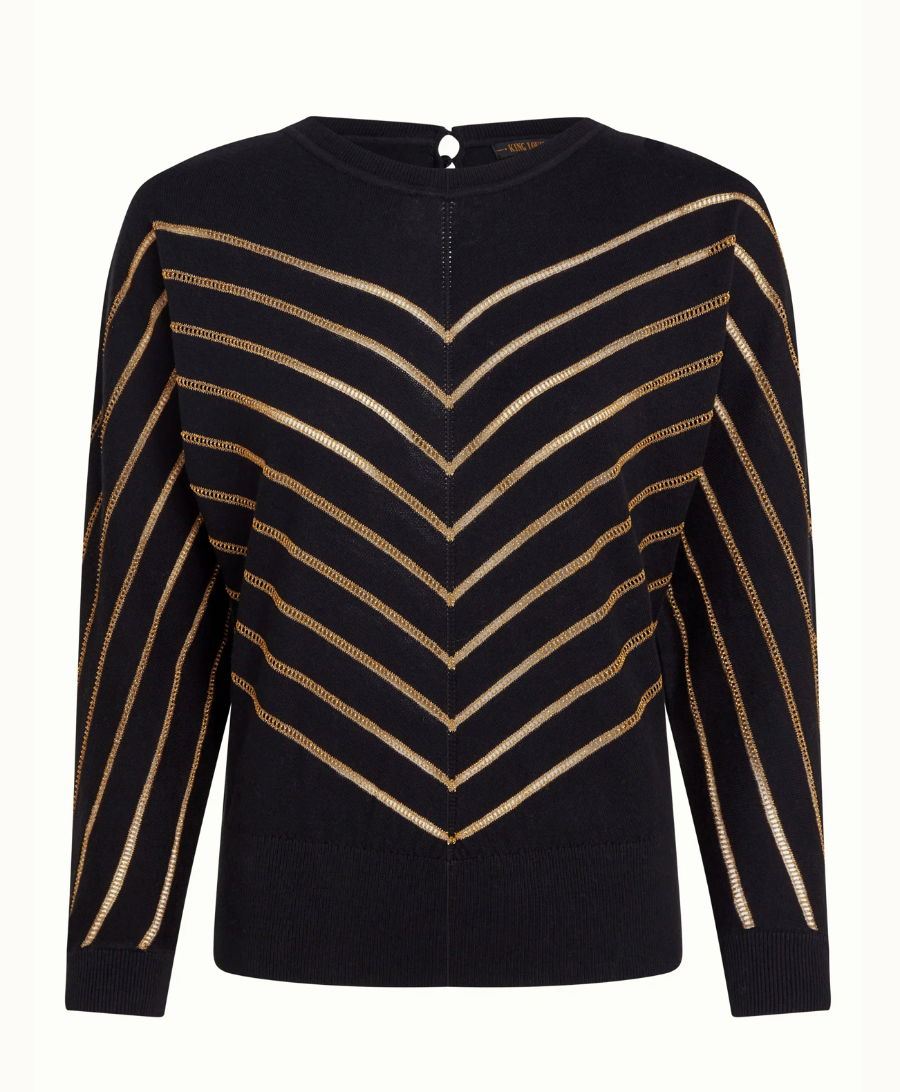 Dieses zeitlose, locker sitzende Stricktop kombiniert Komfort mit einem Hauch von Luxus. Der elegante Schlaufenverschluss am Rücken verleiht dem Design eine raffinierte Note, während der goldene Lurex subtile Akzente setzt. Ein Stück, das selbst eine Stilikone wie Marlene Dietrich geliebt hätte.