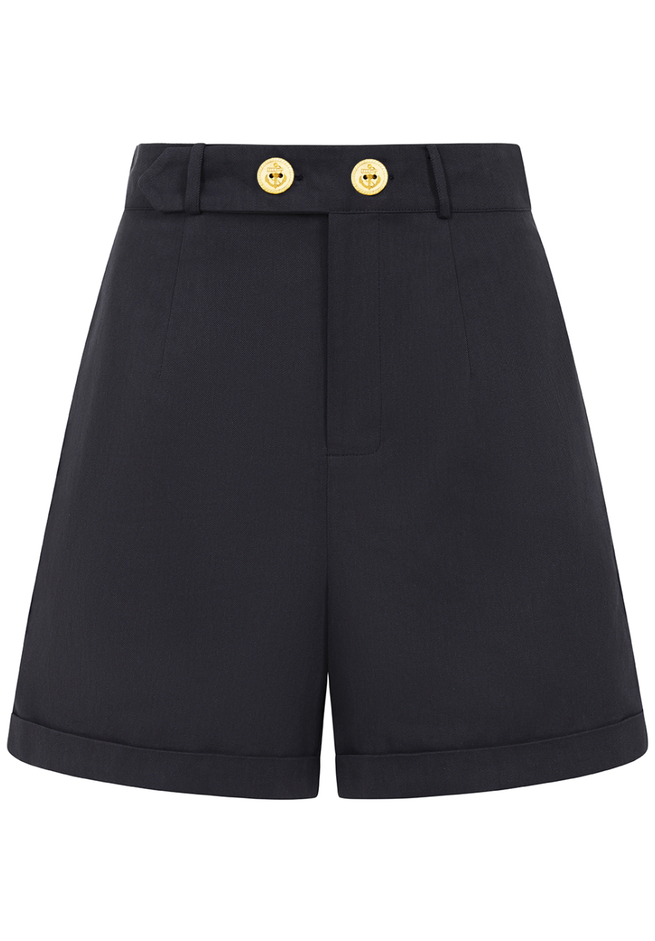 Besonderheiten: Goldfarbene Knöpfe und umgeschlagene Beinabschlüsse