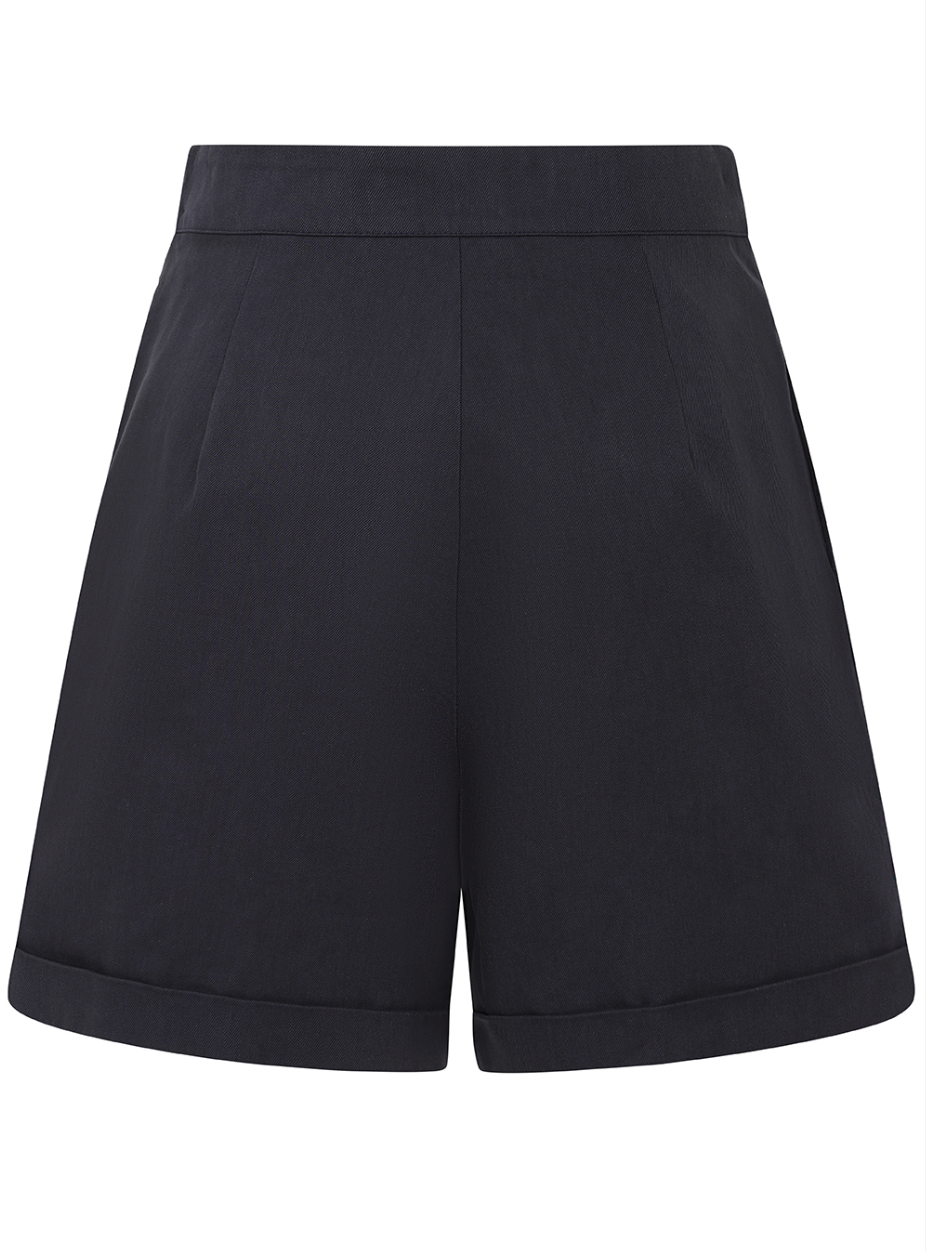 Diese Shorts in einem klassischen Dunkelblau haben eine hohe Taille und umgeschlagene Beinabschlüsse. Die Knöpfe vorne und die Gürtelschlaufen verleihen ihnen einen eleganten Touch. Perfekt für einen schicken, zeitlosen Look. Kombiniere sie mit einem gestreiften Oberteil in Blau und Weiß. Ergänze den Look mit weißen Sneakers oder Segelschuhen und einer Matrosenmütze für einen authentischen Matrosen Stil.