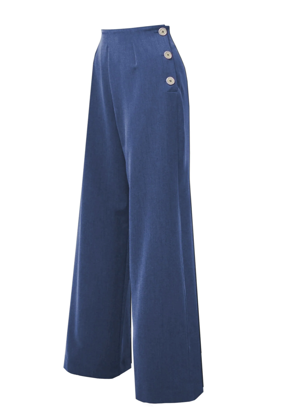Jeder liebt diese klassische Swinghose! Dieses Modell ist von den 1940er Jahren inspiriert, mit weitem Bein und hoher Taille, sie hat 3 Knöpfe im Vintage-Stil auf der linken Seite zum schliessen. Mit High Heels oder Flats für das Wohlfühl-Retro-Flair!
