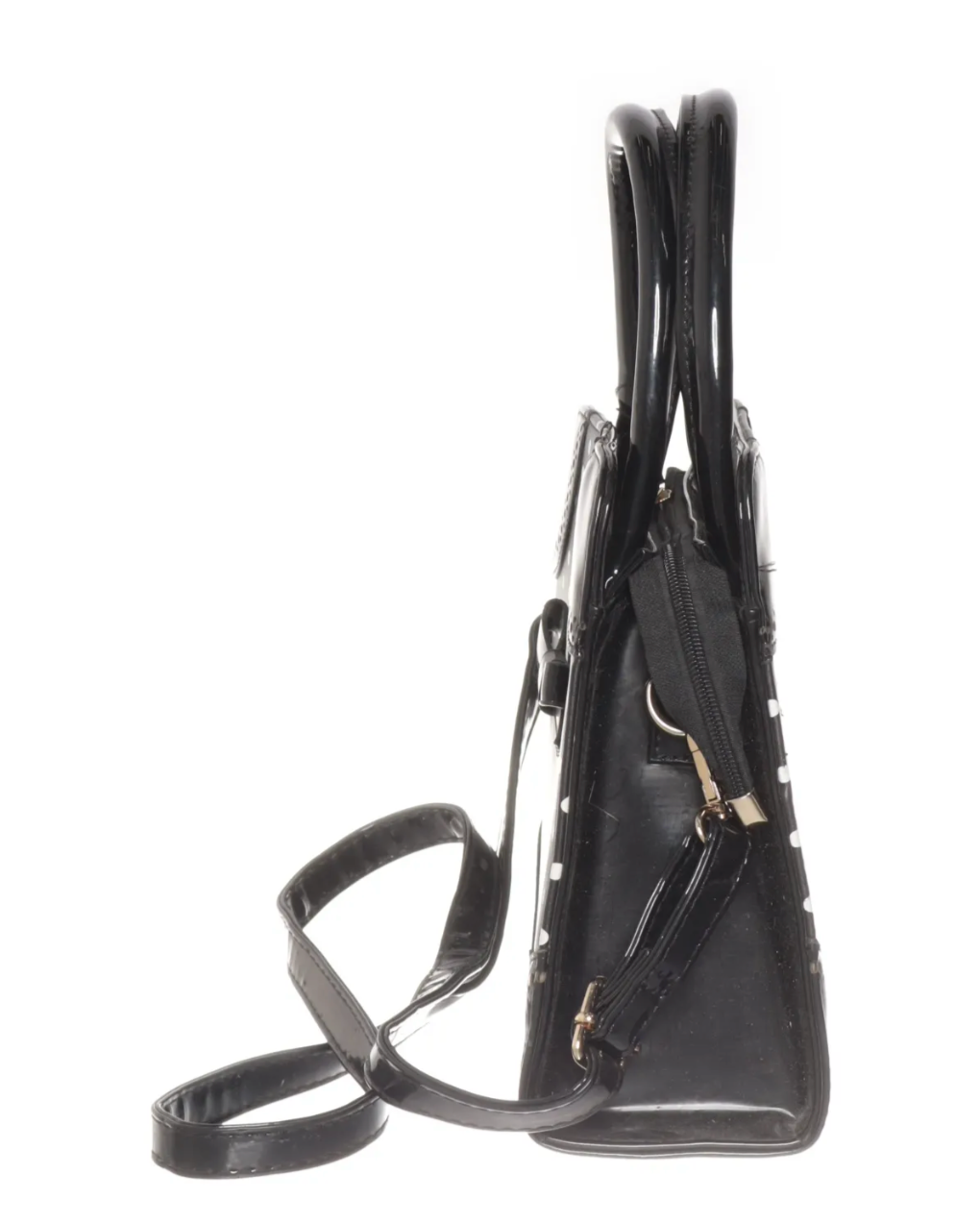 Diese bezaubernde Handtasche im Retro-Stil ist das perfekte Accessoire für alle, die verspielte Eleganz mit praktischer Funktionalität verbinden möchten. Das klassische Design in Schwarz mit weißen Polka Dots wird durch glänzende Lackdetails sowie zwei dekorative Schleifen – eine auf jeder Seite – stilvoll ergänzt und sorgt für einen rundum charmanten Look. Neben den stabilen Tragegriffen bietet die Tasche auch einen abnehmbaren, längenverstellbaren Umhängegurt, der vielseitige Trageoptionen ermöglicht – ob als klassische Handtasche oder bequem über der Schulter. Das strukturierte Design sorgt für Formstabilität, während das Innenfach Platz für alle wichtigen Dinge des Alltags bietet.