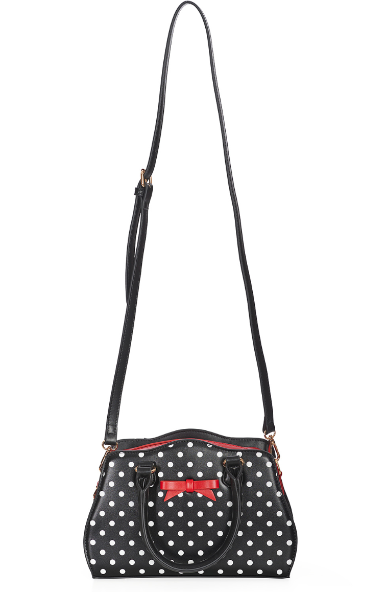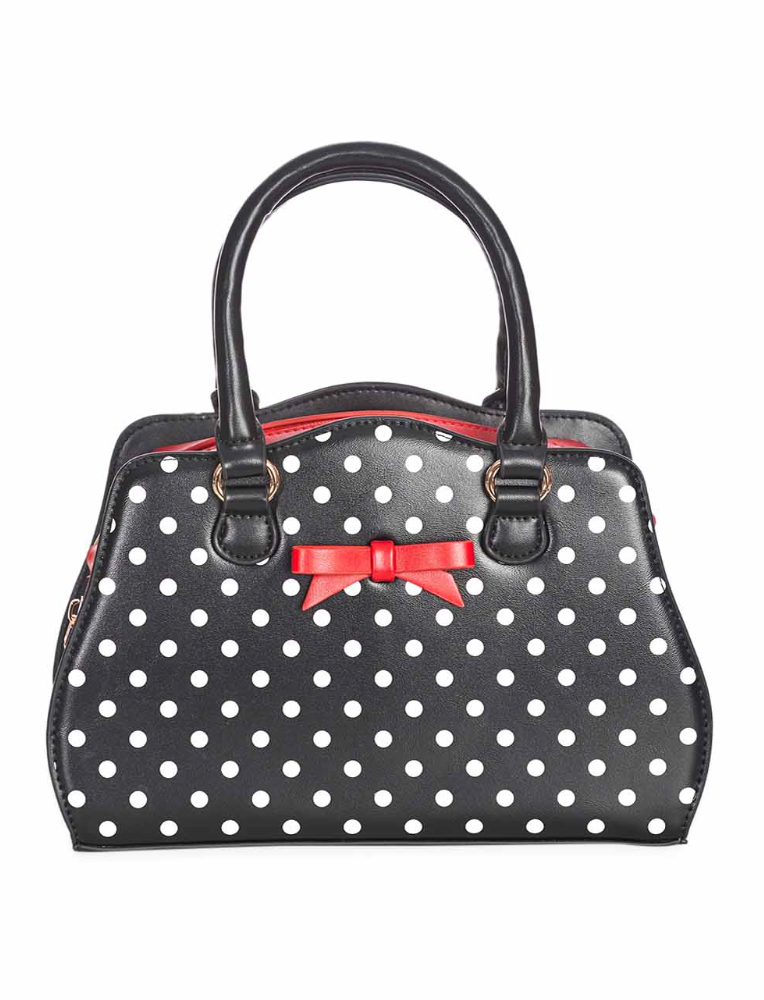 Diese charmante Handtasche im klassischen Polka-Dot-Design bringt Retro-Flair in deinen Alltag. Die Kombination aus schwarzem Kunstleder mit weißen Punkten und leuchtend rotem Mittelteil sorgt für einen auffälligen und dennoch eleganten Look. Als besonderes Detail ziert eine kleine rote Schleife die Vorderseite – ein verspielter Hingucker, der jedes Outfit aufwertet. Trotz ihrer kompakten Form bietet die Tasche durchdachten Stauraum und praktische Features für unterwegs.