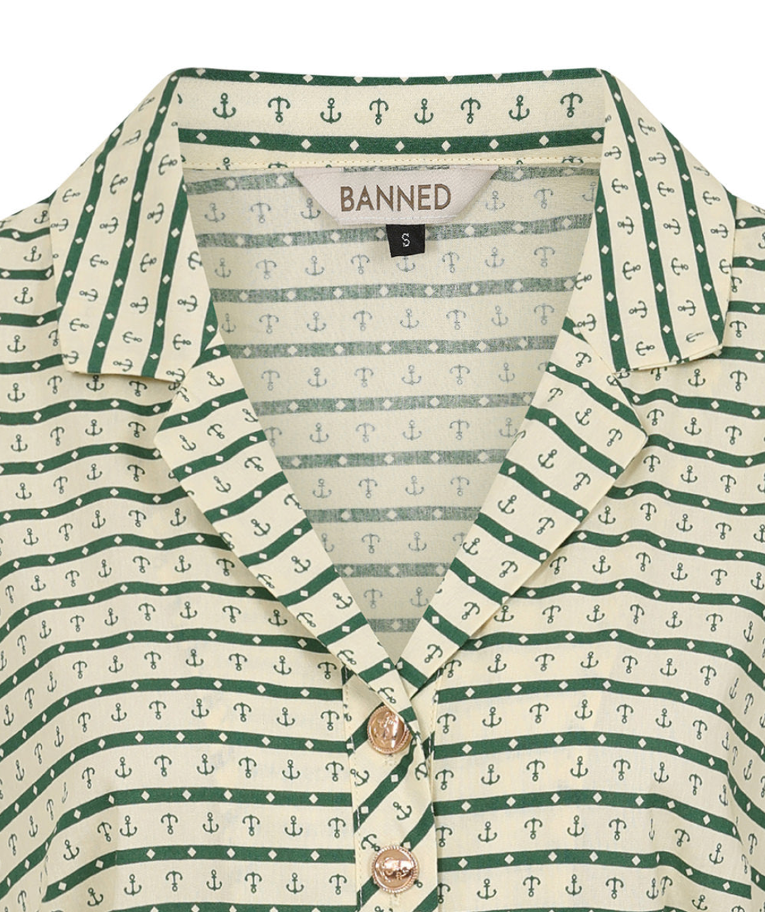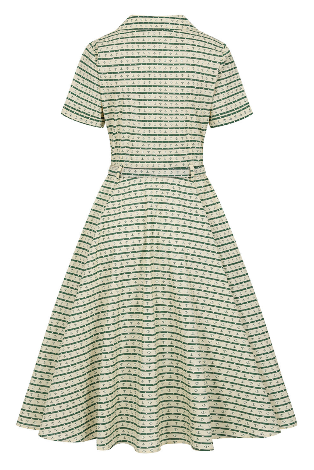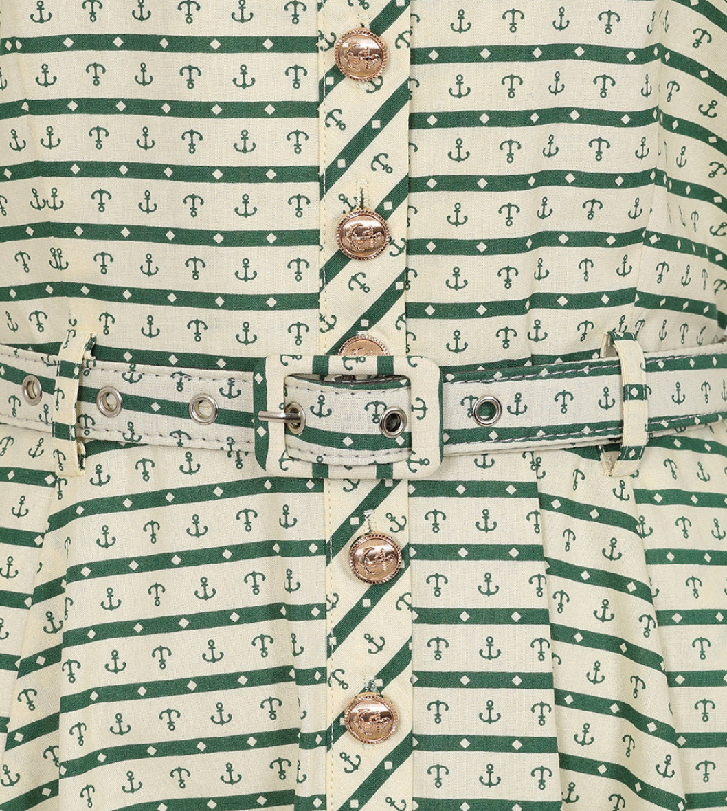 Erlebe den Retro-Flair mit diesem schönen Sommerkleid im Stil 50er Jahre und ergänze Deine Vintage-Garderobe. Mit diesem Kleid im Hemdblusenstil und Streifen in denen kleine Anker zusehen sind fällst du auf, egal ob am Strand oder in der Stadt.