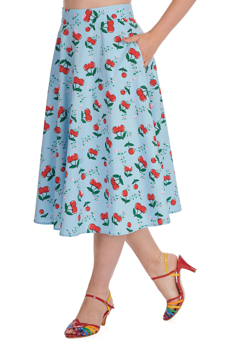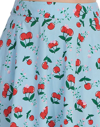 Der hellblaue "Cherry Cartoon Swing Skirt" von Banned ist ein traumhafter Rockabilly-Style-Rock mit fröhlichem Kirschen-Print. Mit seinem 5 cm breiten Taillenbund, versteckten Eingrifftaschen und Reißverschluss mit Häkchen ist er nicht nur praktisch, sondern zaubert auch gute Laune. Aus leichtem, stretchigem Baumwollmaterial und einer Gesamtlänge von 67 cm in Größe M. Perfekt für den Sommer!